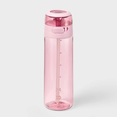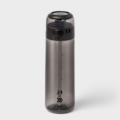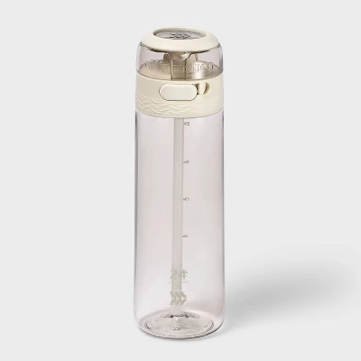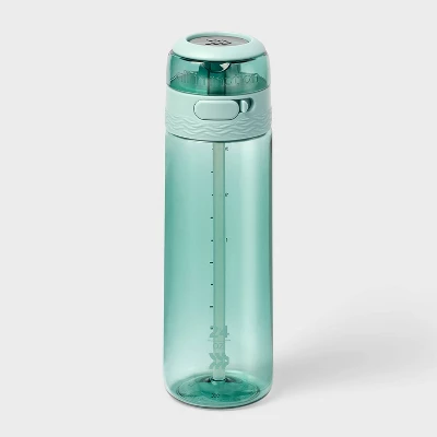 Tritan hydration water bottle made from plastic with polypropylene lid for active days. Features a lid with sipper design for easy drinking, as well as measurement markings to track consumption. Ideal for cold beverages like juices, lemonade, shakes and more. Dishwasher safe on top of rack for quick and easy cleaning.