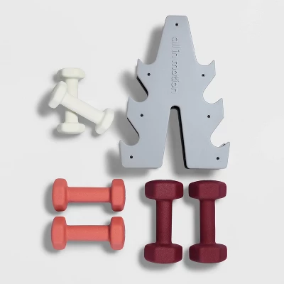 6-Piece weight set in varying colors and sizes for everyday exercising. Made with soft neoprene exterior for a comfortable grip and secure floor placement. Features no-slip design for easy lifting. Includes stand for easy storage.