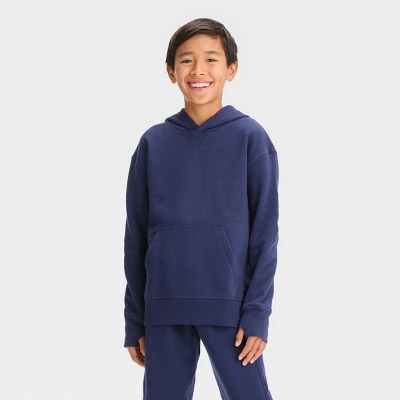Solid-color hooded sweatshirt made from midweight cotton and recycled polyester fleece fabric for cozy, comfy wear. Designed with ribbed cuffs with thumbholes for a snug fit. A kangaroo pocket comes in handy for stashing small essentials and warming hands.