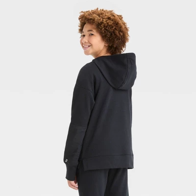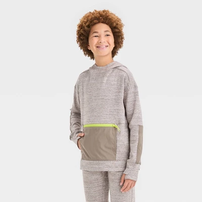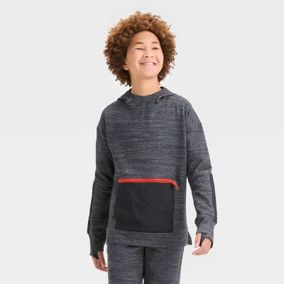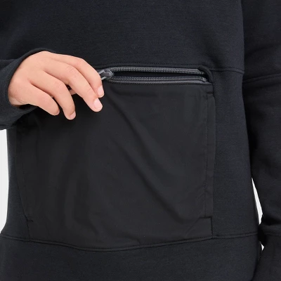 Long-sleeve pullover fleece hoodie is made of a heavyweight cotton-recycled polyester blend to keep them warm and cozy all day. Attached hood keeps their head covered, and the long sleeves with thumbhole cuffs lend enhanced warmth while keeping their arms covered with a stay-put fit. Plus, the front zippered pocket offers a secure spot for their on-the-go items.