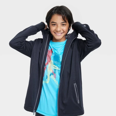 Midweight fleece sweatshirt made from a recycled polyester blend with faux shearling lining for cozy comfort. Long sleeves with thumbhole cuffs and a hooded neckline provide snug warmth. The full-length zip-up front makes it easy to wear, and zippered side pockets let them store essentials and keep their hands warm. Casual fit allows for convenient layering.