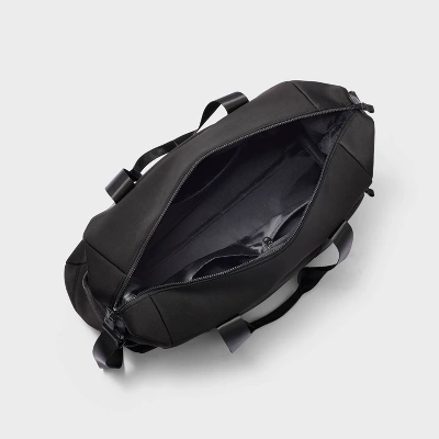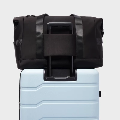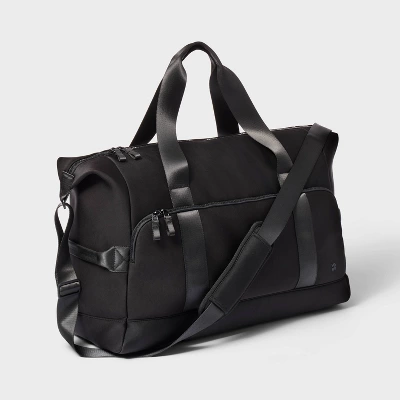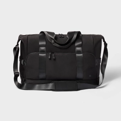 Cream weekender bag made from faux neoprene with water-resistant properties for active days. Features a main compartment, slip pockets, and a side pocket with a zipper closure for stashing your on-the-go essentials. Adjustable shoulder strap and double handle for added convenience.