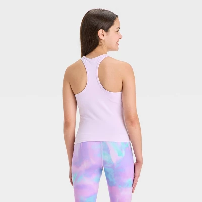 Square-neck tank top with a racerback. Made of midweight interlock fabric blend of recycled polyester and spandex for flexible wear that moves and stretches with your child. Features removable cups and built-in shelf bra for customizable and comfortable coverage. Tailored in a fitted silhouette with below-waist length.