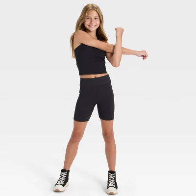 At-thigh bike shorts designed in a solid hue with a regular-rise cut. Made from nylon-spandex blend knit fabric and featuring a seamless design to offer stretchy comfort to your child during a range of activities. Ribbed texture and a solid color complete the sporty look.