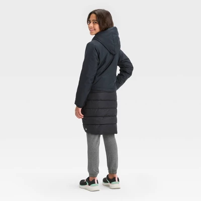 3-in-1 long-sleeve jacket crafted from midweight fabric with taffeta lining and soft filling. A front snap closure makes it easy to wear and layer, while detachable quilted skirt adds additional comfort. Hooded design with cuffs provides more coverage and a snug fit. Plus, side pockets provide space for their hands and small items.