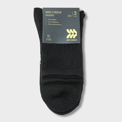 Three-pair pack of black, quarter crew socks. Crafted from soft fabric with spandex, flat seams, and cushioned heel and toe to help keep your feet comfortable. Mid crew socks with arch support make a basic addition to your wardrobe.