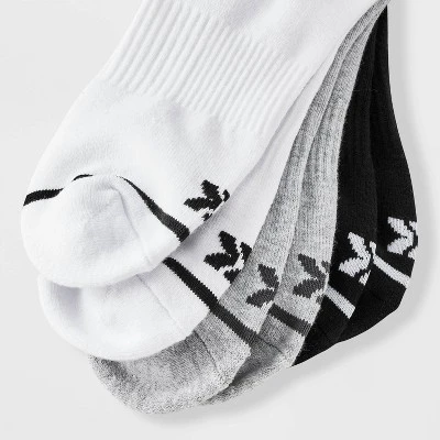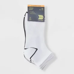 Six + one bonus pair pack of active ankle-height socks in solid gray, white and black. Made from a moisture-wicking, midweight fabric blend with ventilating mesh to help keep your feet cool, comfy and dry. Flat seams, arch support, reinforced heel and toe, and zone cushioning round out the comfortable fit.