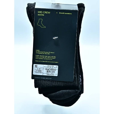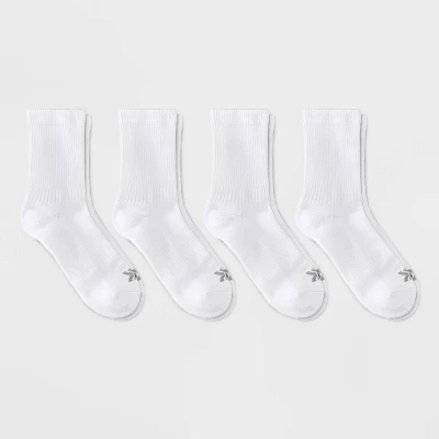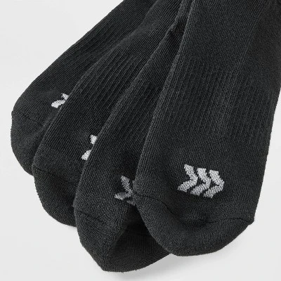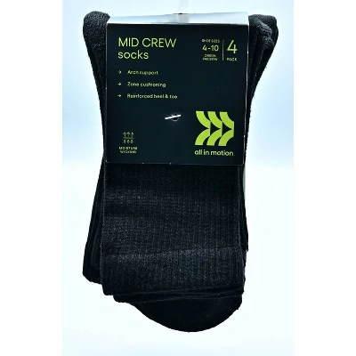 Four-pair pack of cushioned active athletic crew socks. Made from a moisture-wicking, midweight recycled polyester blend with nylon and spandex to help keep your feet comfy wherever the day takes you. Reinforced toe and heel, arch support and zone cushioning provide an all-around snug fit.