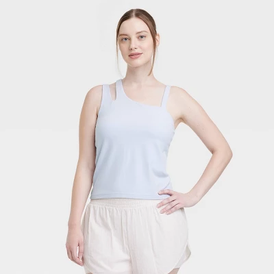 Sleeveless tank top made from moisture-wicking fabric for dry comfort and a pullover style. Made with soft and stretchy fabric and a built-in shelf bra for comfort. Designed with a asymmetrical neckline and at-hip length, this tank top also comes with turnback hem for sleek style.