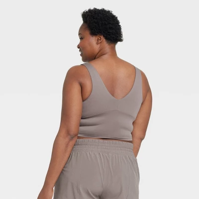 V-neck cropped bra in a solid hue lends style and function to lower-intensity workouts. Constructed from opaque moisture-wicking, quick-dry fabric with UPF 50+ sun protection for comfortable wear. Features built-in shelf bra with removable cups for a customizable fit that offers light support. V-neck and back give the sporty look a modern touch.