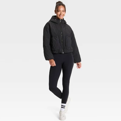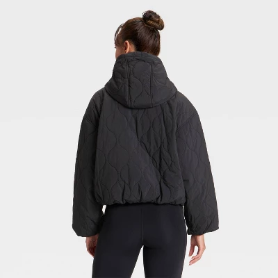 Quilted jacket designed in a solid shade with a decorative stitched pattern. Crafted from lightweight nylon, 100% recycled polyester filling and nylon lining to help keep you comfortable and warm during your outdoor adventures. Features a front full-length zipper for simple layering, plus a hooded neckline with a drawstring for adjustability and gathered edges on the long sleeves and mid-length hem for enhanced warmth. Patch pockets on the front complete the design with space to stash small items.