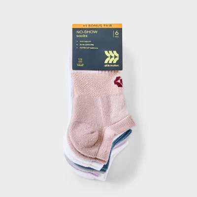 Six + one bonus pair pack of socks, including three pairs in white and four pairs with striped accents in blue, pink, gray and purple each. Made from a moisture-wicking, midweight recycled polyester blend with spandex as well as ventilating mesh to help keep your feet cool, comfy and dry. Arch support, reinforced heel and toe, and zone cushioning round out the comfortable fit. Plus, the no-show style makes them easy to wear with a variety of shoes.